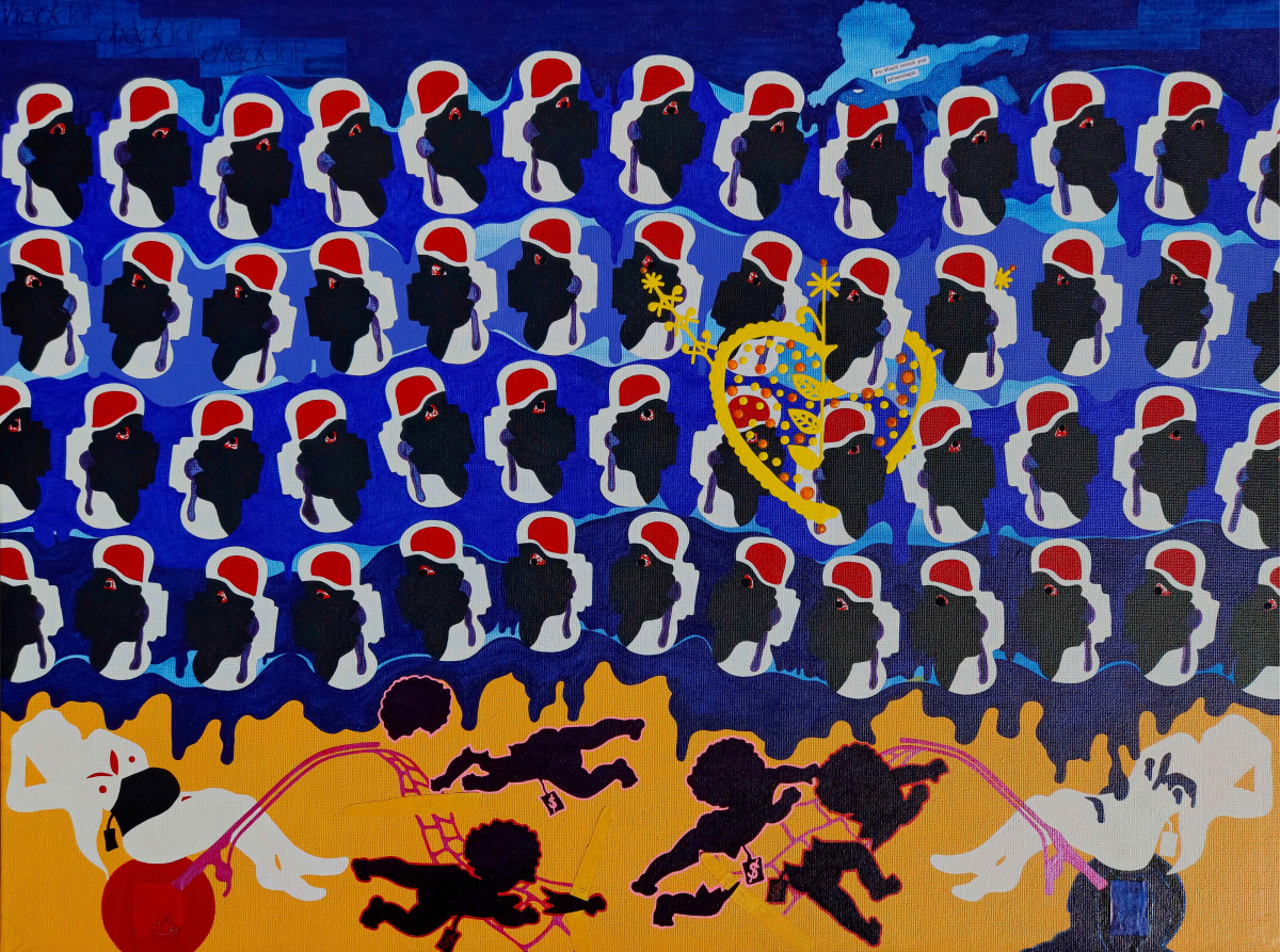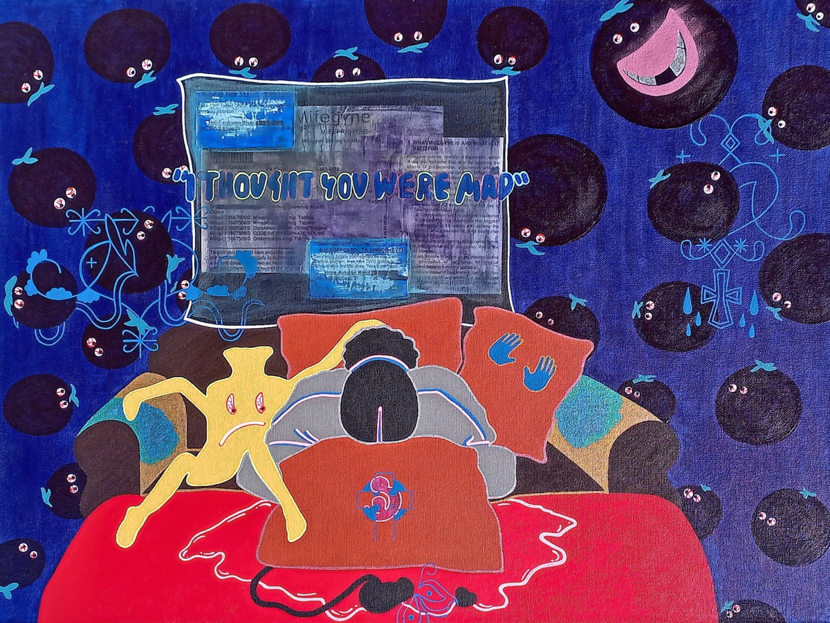 At 7 weeks pregnant your baby is the size of a blueberry. On day 2 of a medical abortion, you jam 4 tablets up your vagina, close your eyes, and choke down another 2 with something that doesn’t make you want to vomit. Within an hour your womb becomes an intolerable cesspit of pain. You cry. Try and pop the pain away. Nothing works. You clutch your hot water bottle like your life depends on it. Try to burn the pain into submission. Nothing works. The crimson tide begins. Your cervix softens and opens. Mifegyne has duped your body into labour. Then . . . you feel the blueberry drop . . . and you pull out the remains of the umbilical cord. Fast forward 3 weeks and 92 saturated sanitary pads later, you’re still bleeding and cramping but the gynaecologist doesn’t care because the piss stick speaks the omen of ‘not pregnant’. 5 weeks down the road and you’re still bleeding and cramping but the gynaecologist doesn’t care – she’s clearly more into the lunch she munches as you speak on the phone. You’re blue. Death feels like your saviour. You need to speak to a therapist, but everyone in NZ is vanilla. You must have someone black, someone Afrocentric. Someone who understands the intersectionality of this shitshow. You were sexually assaulted, and he said “I thought you were mad,” which a black shrink would just get, no history lesson required. The strong black woman stereotype takes a hold, and you paint because when there’s nothing left to do that’s all you can do.