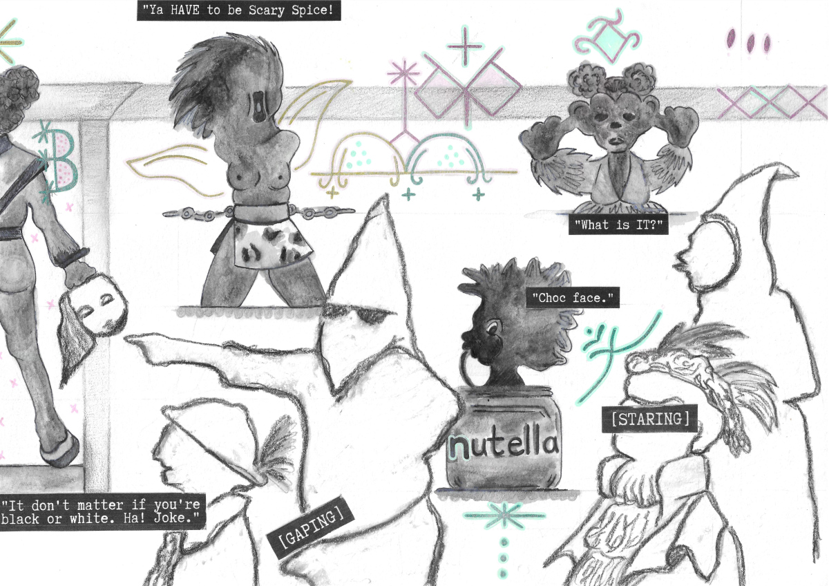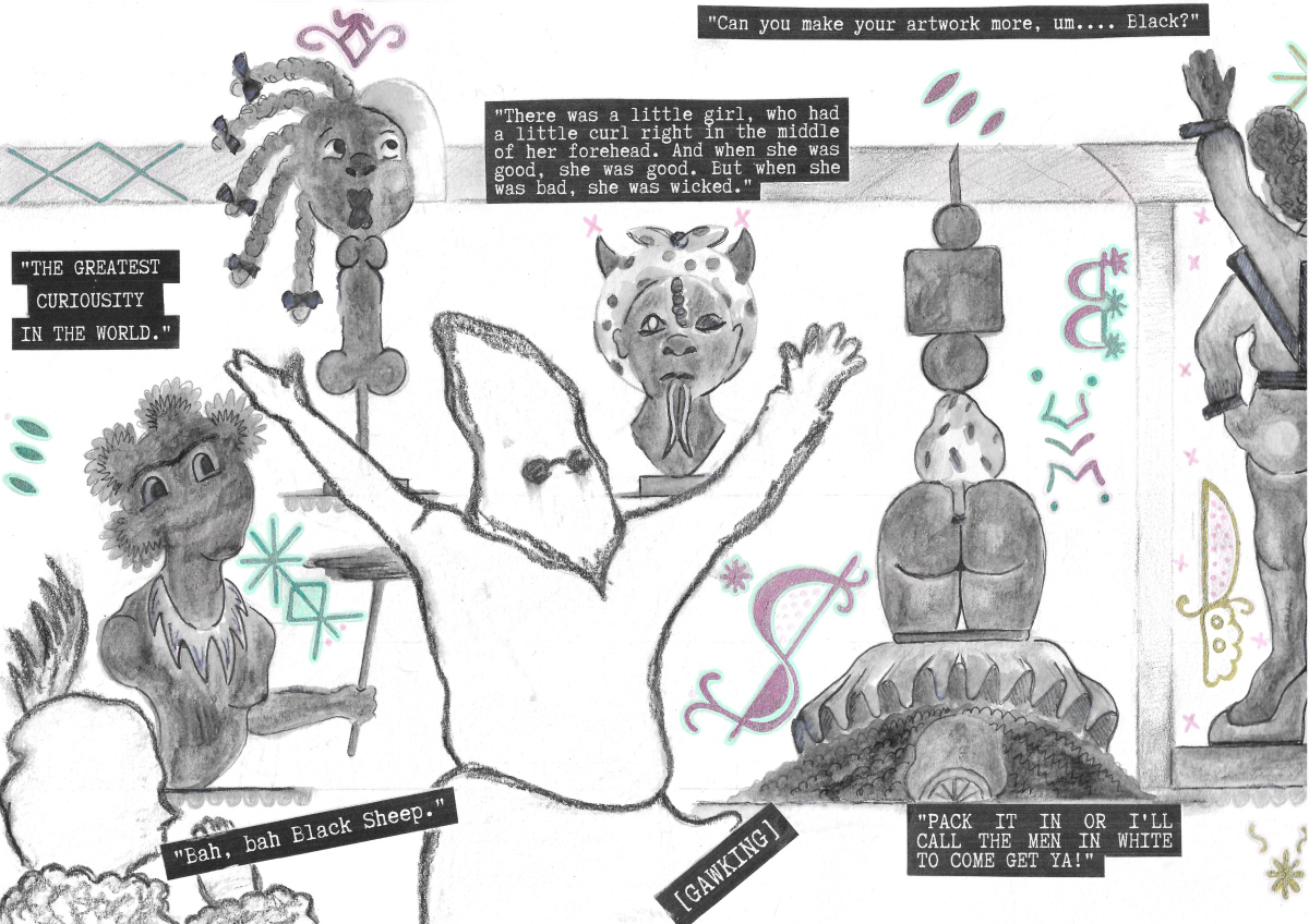 Novelty-Negress is a social critique on being a black body in a white space. Revealing how the white gaze removes the humanity of black people, by turning them into objects of curiosity, fascination, or shock for personal and/or public entertainment. These works not only narrate instances in which River has been treated as a new or unusual experience, as a novelty, in a plethora of Eurocentric environments. They also open discourse on how Black artists react to being treated as novelties - as objectified subliminal tokens - in contemporary art today.